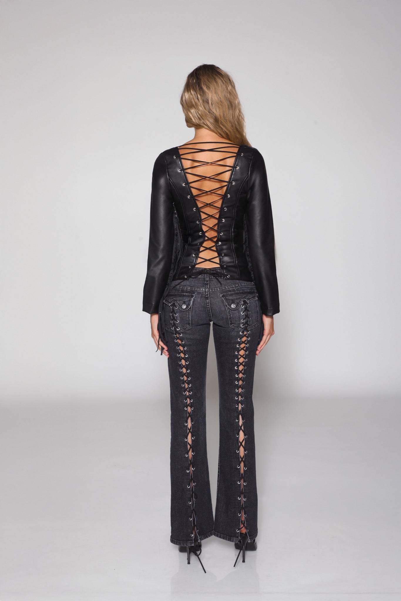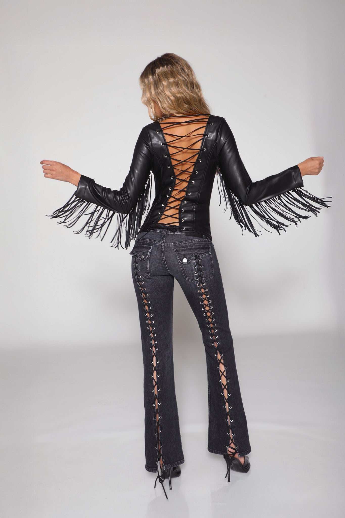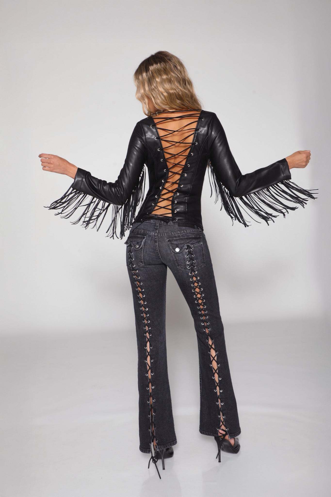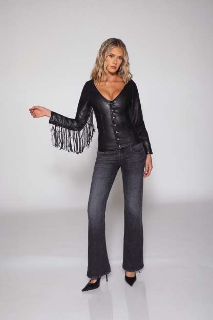 Straight from the desert and into your closet, introducing the Desperado Jacket. This distressed leather jacket is the perfect statement piece to complete your Americana vibe. Its corset backing makes it easy to personalize to your shape and accentuate you in all the right places. Our flirty fringe detail makes you feel effortlessly cool no matter where you are. From festivals to your summer fits, the Desperado will be your new go-to for statement jackets. Now in Dusk-- Our premium, distressed vegan leather.