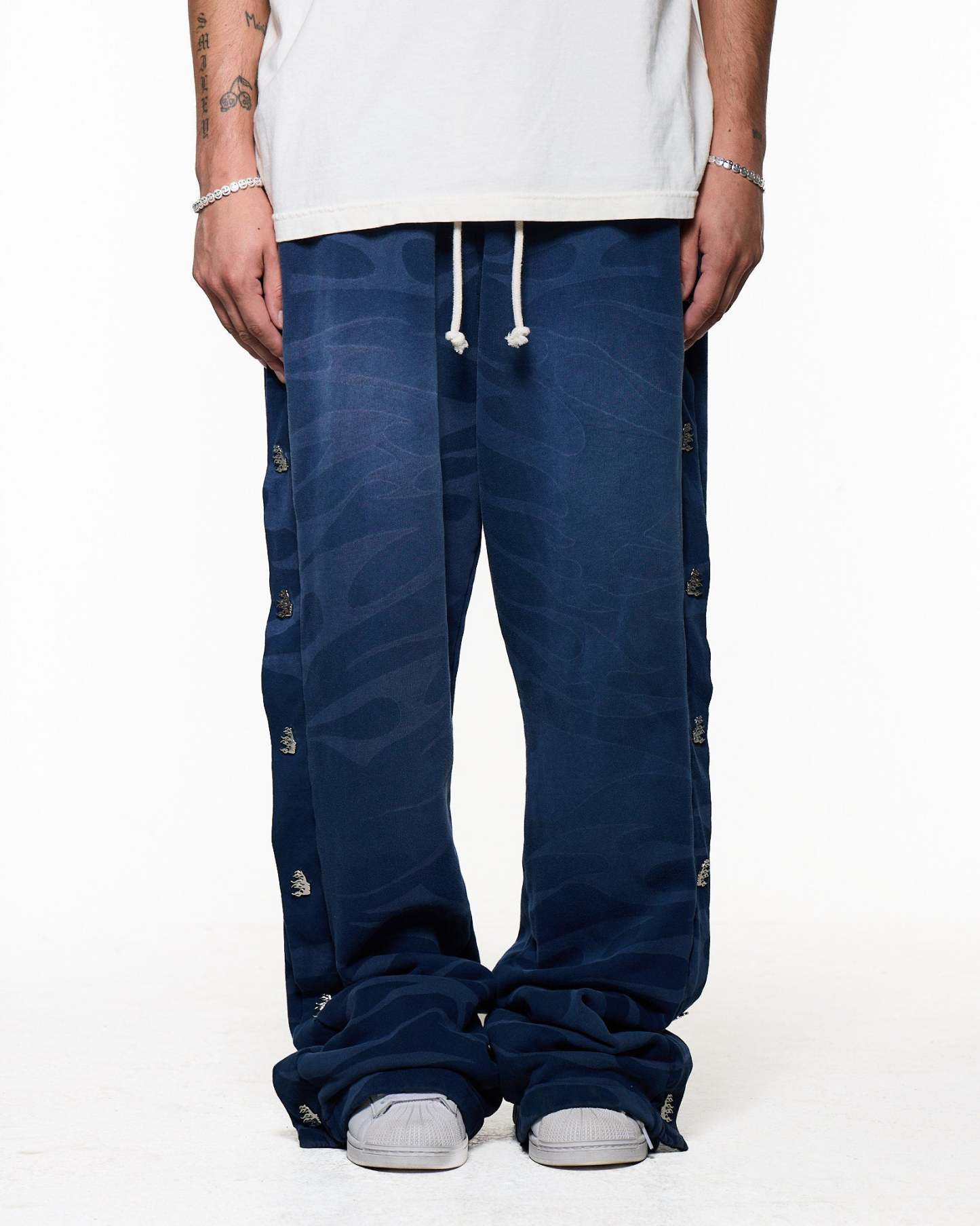 Custom Cut and sew garment manufactured in Los Angeles. Features Hellstar Snap Enclosures on the side panel of pants. Dyed and potassium sprayed with Hellstar Logo jumbo screen print, as well as a Tribal Laser burn. Fits Oversized.