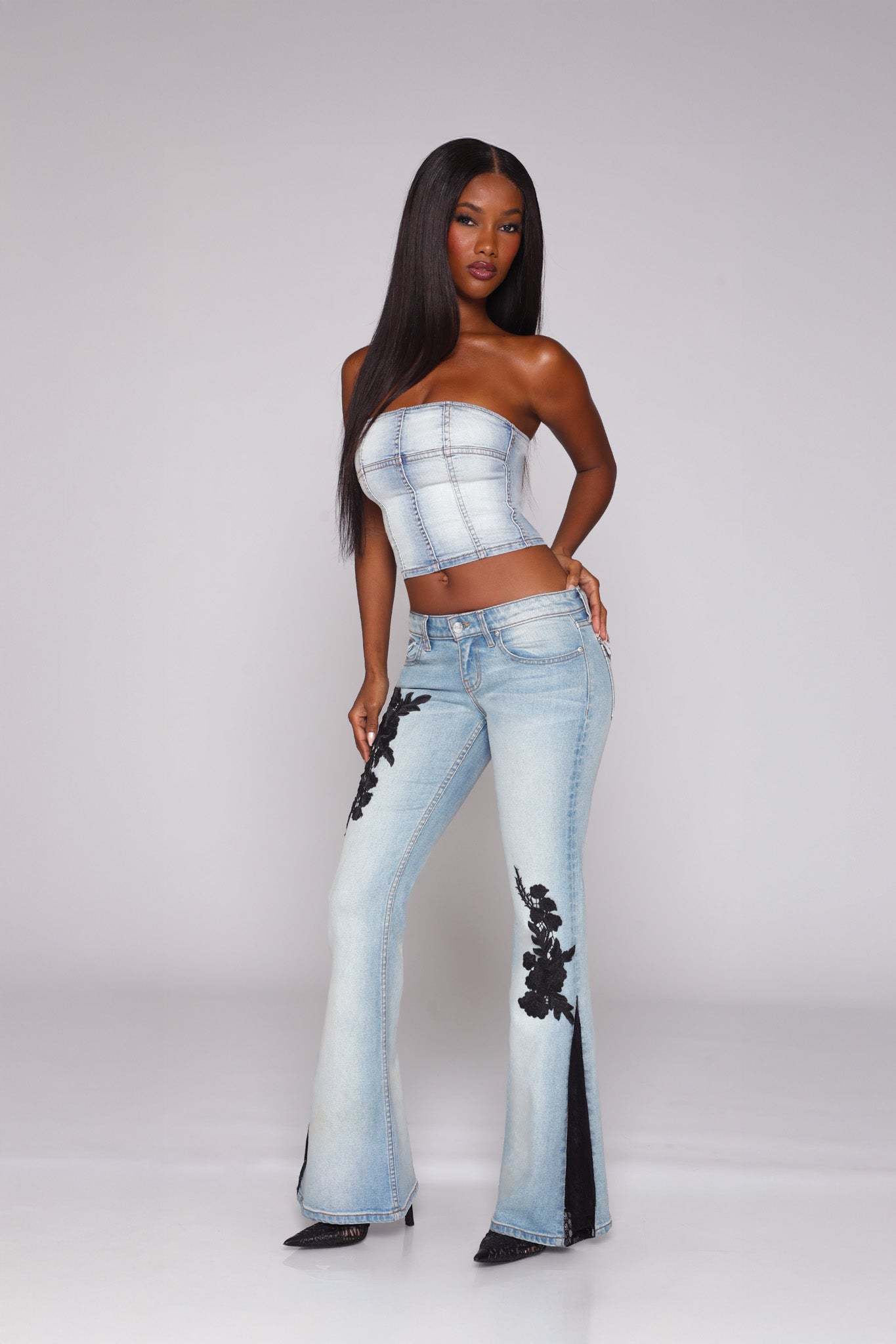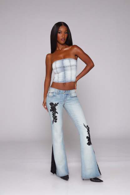 Meet the Icon Dreamer—low-rise, lace-trimmed, and impossible to ignore. This reimagined Icon Jean features lace detailing that runs down the leg and opens at the flare, creating a statement that moves with you. Finished with our signature baby flare silhouette and iconic flap pocket, this pair delivers your Y2K dreams, perfected.