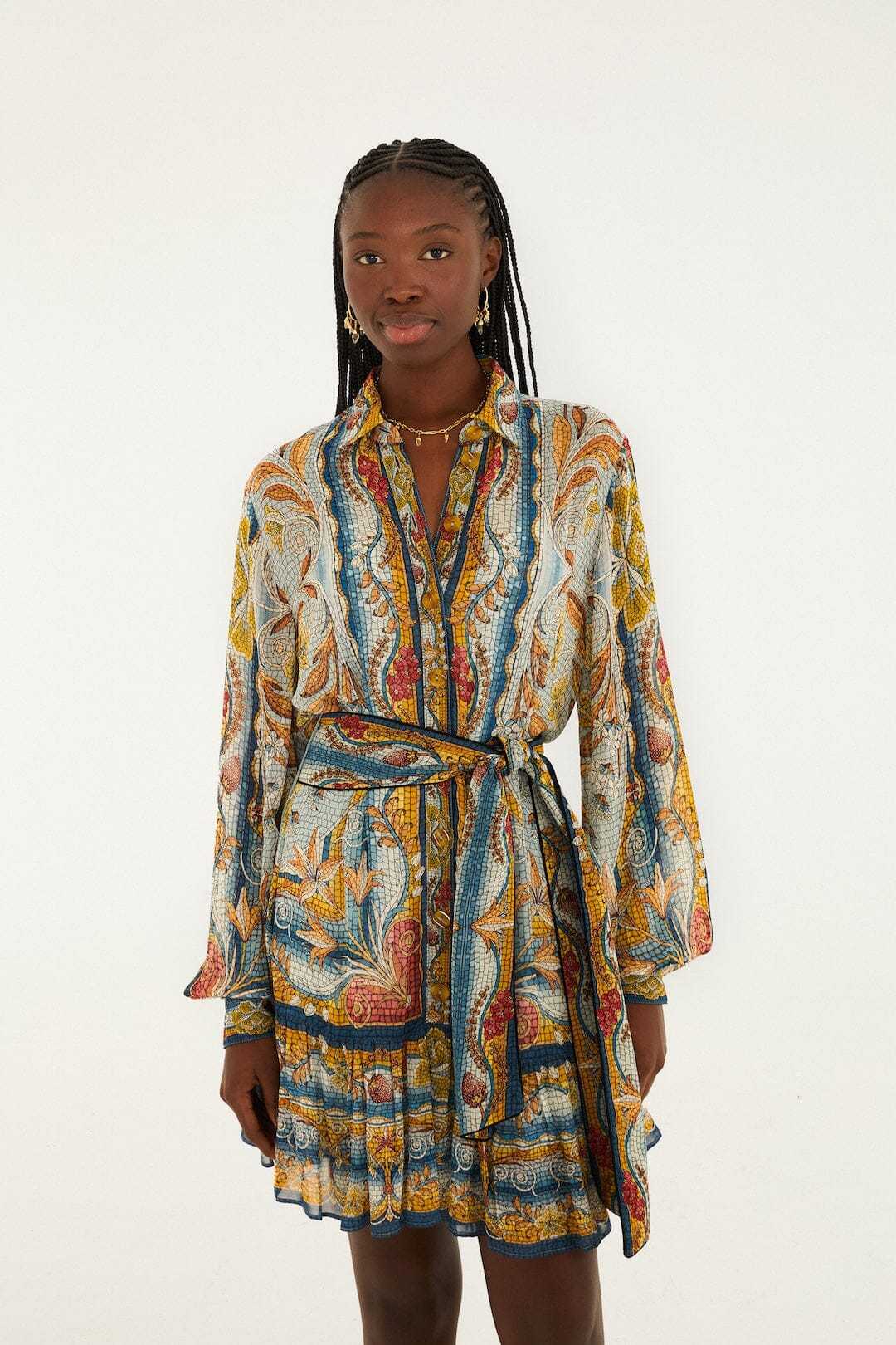 Step into vibrant charm with the Blue Mosaic Garden Belted Mini Dress from FARM Rio. Featuring a playful mosaic-inspired print in soothing blues and crisp whites, its relaxed silhouette flows effortlessly, cinched at the waist with a self-tie belt for a flattering shape. The crisp collar neckline adds a touch of structure, while the breezy fabric invites movement and warmth. This dress captures carefree spirit and garden-fresh joy in every stitch.