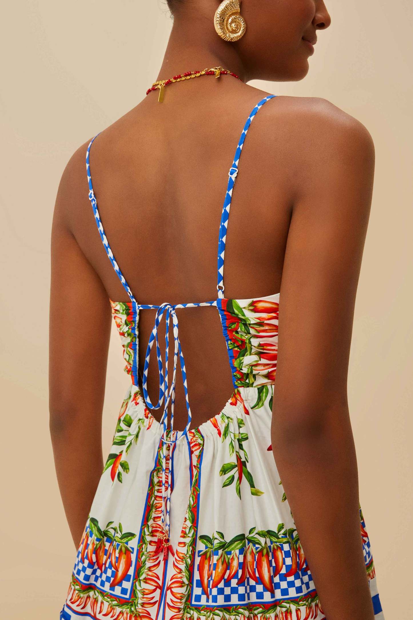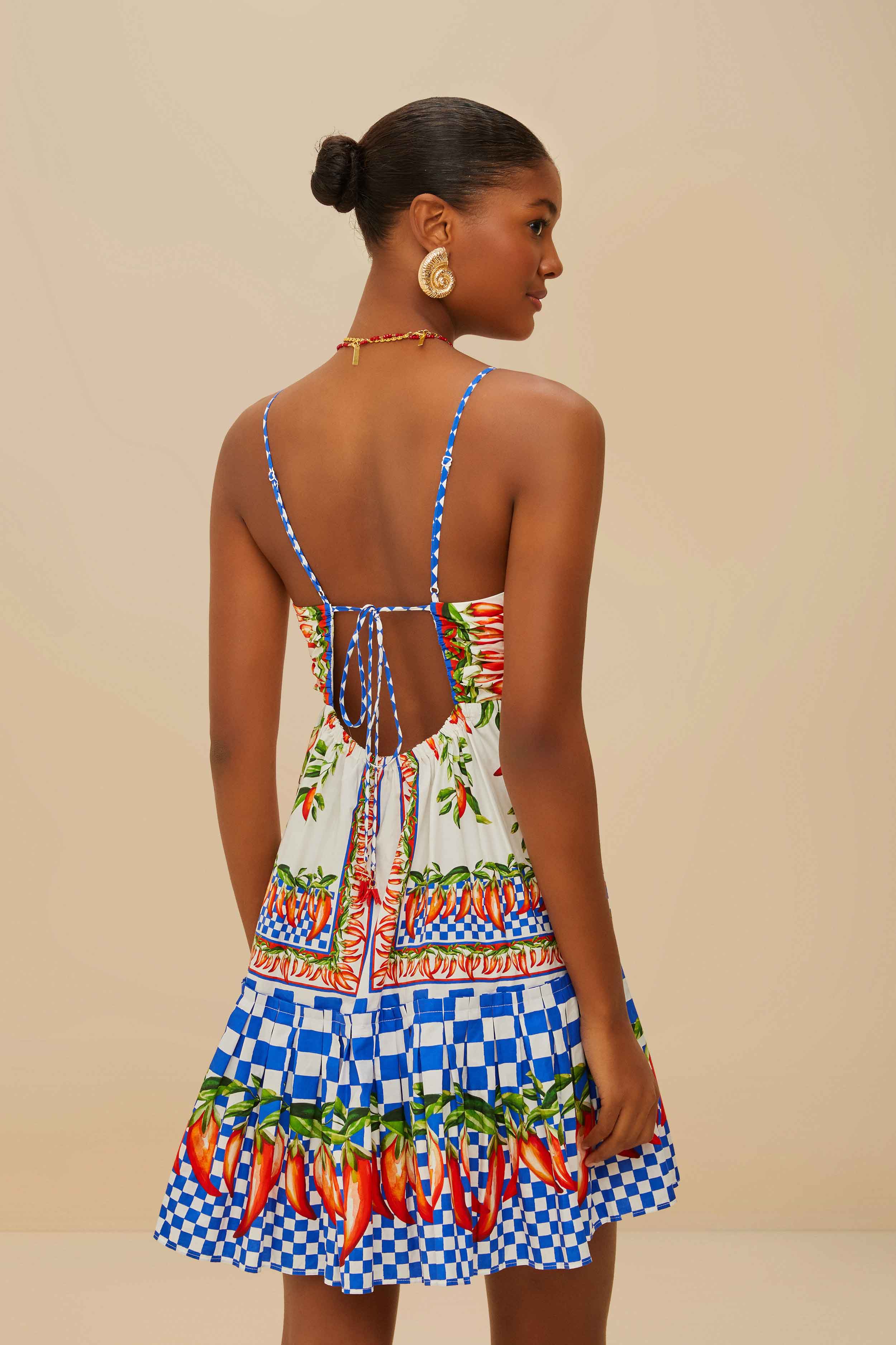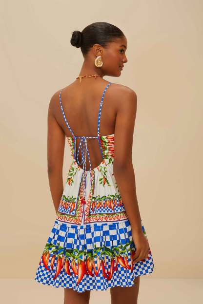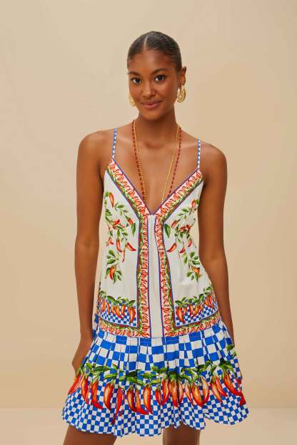 The Off-White Picnic Peppers Ainika Organic Cotton Mini Dress captures the essence of playful elegance with a vibrant pepper motif and lively checkered hem. Its flattering V neckline and adjustable back add a touch of breezy sophistication. Crafted from responsible materials, this dress radiates a joyful charm perfect for sunny adventures. A delightful piece that brings together whimsical patterns and effortless style, embodying FARM Rio's spirited aesthetic.