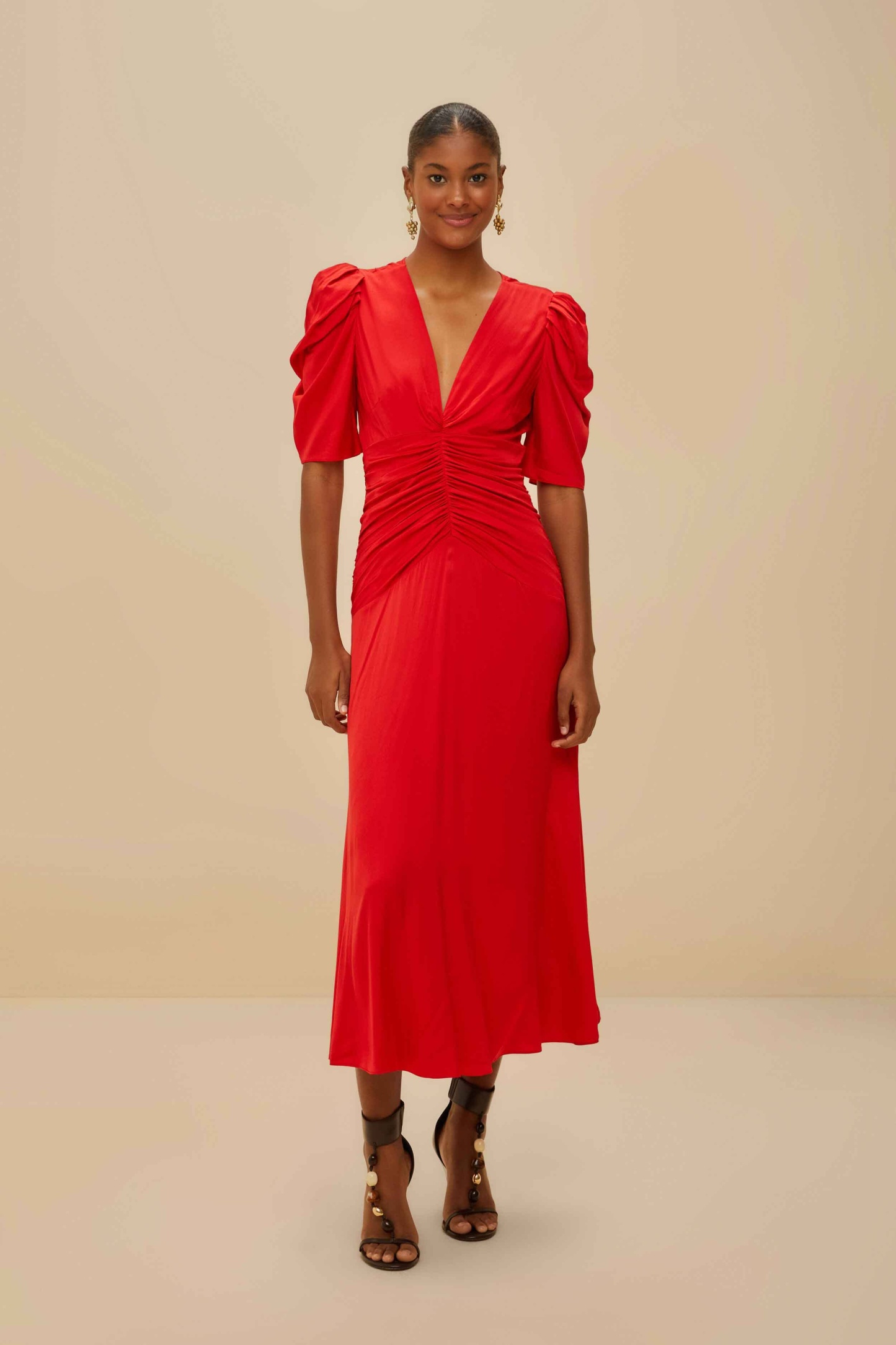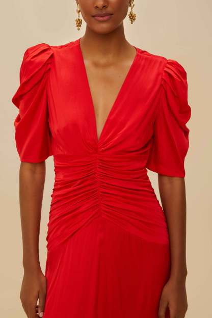 Red Gathered Midi Dress