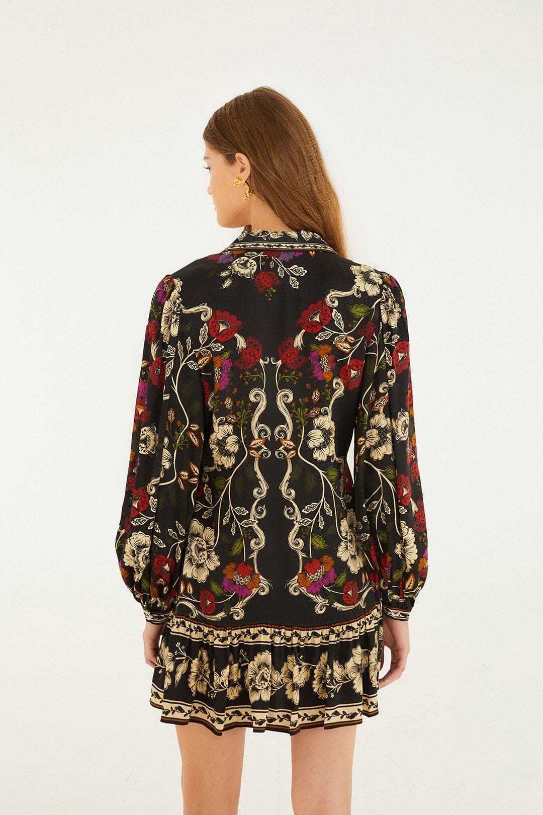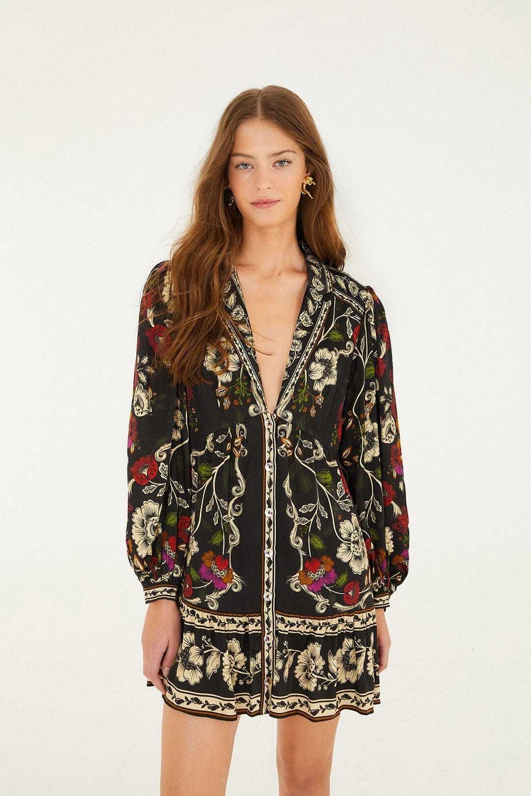 Embrace timeless elegance with the Black Rococo Flowers Mini Dress by FARM Rio. Crafted from breathable Lenzing® Ecovero® viscose, it floats effortlessly with a flattering V neckline and a playful silhouette that sways with every step. Delicate rococo floral patterns dance softly across the black fabric, weaving warmth and vibrant energy into this dress—perfect for those who cherish beauty in every detail and a touch of spirited charm in their wardrobe.