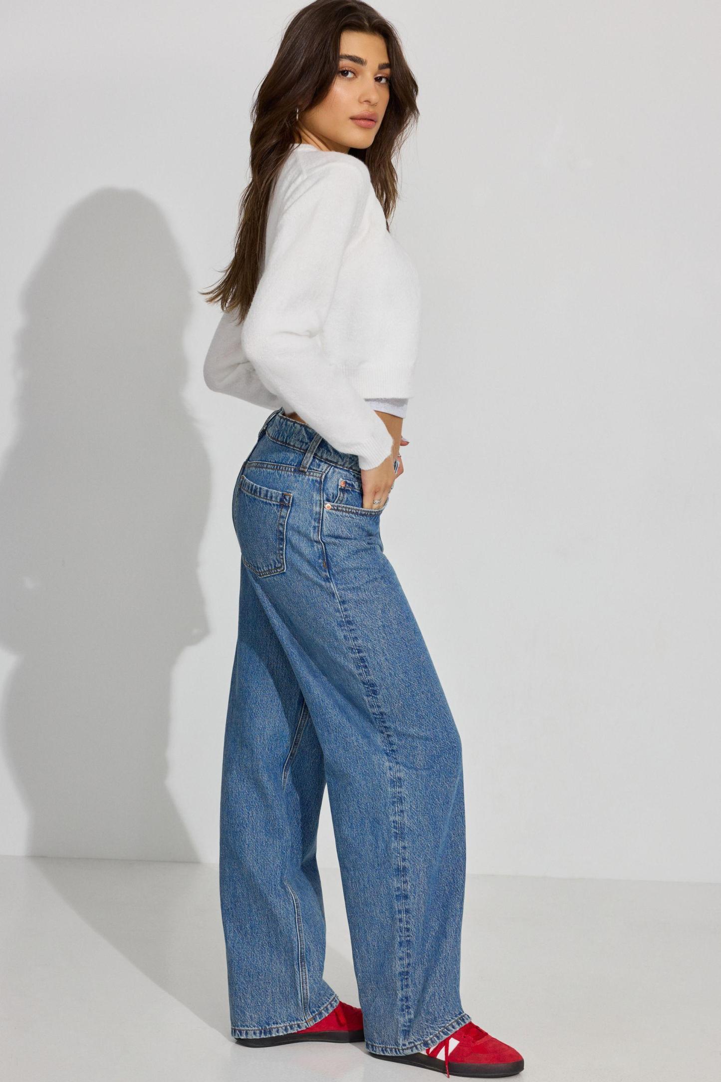 These baggy fit jeans sit low on the hips and come with a bigger, full-length leg that bunches at the bottom. Perfect for your biggest sweater or your tiniest shirt.
