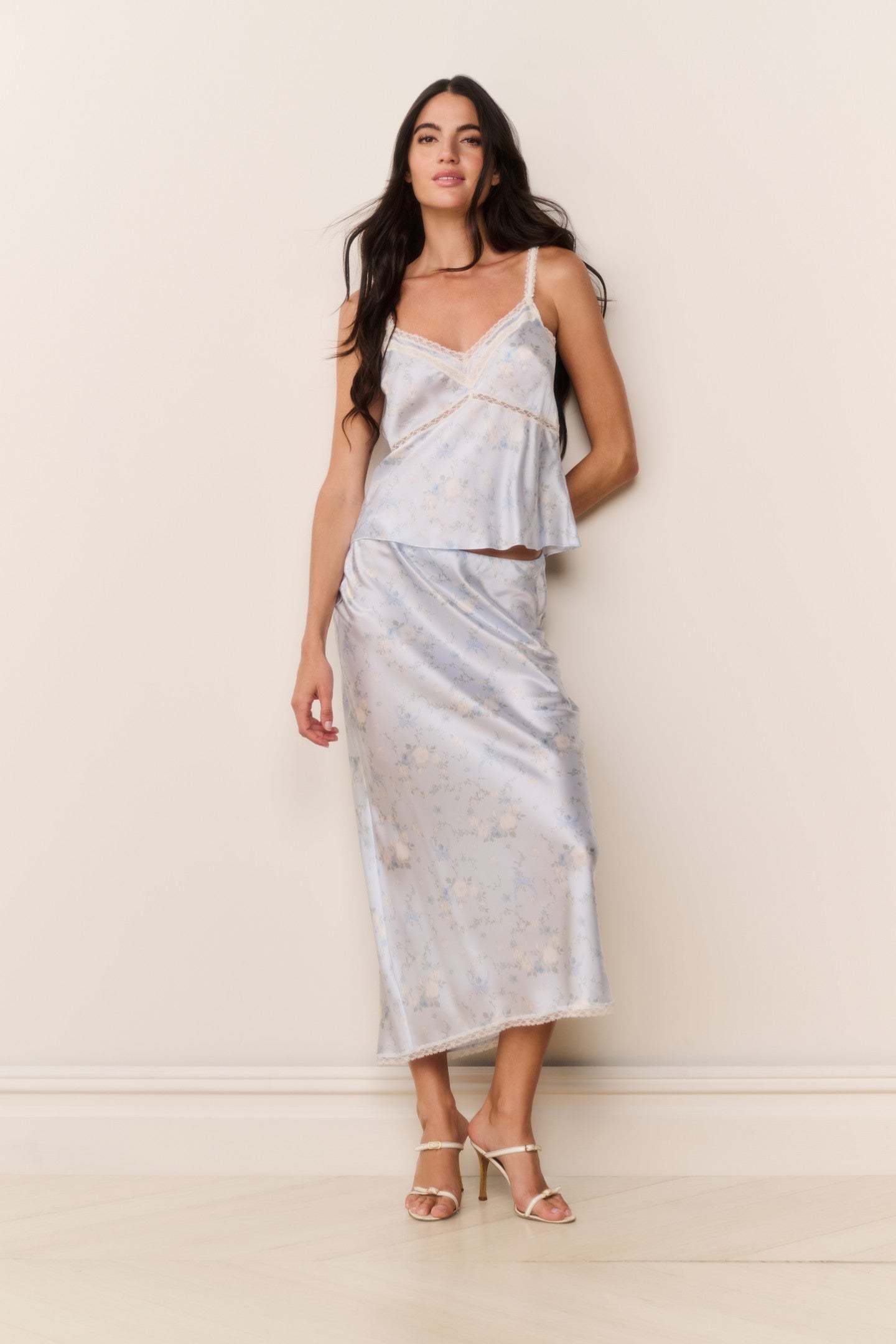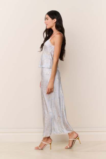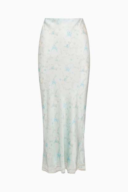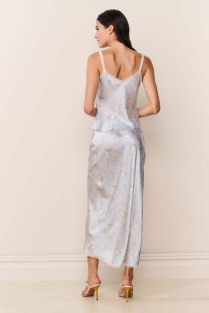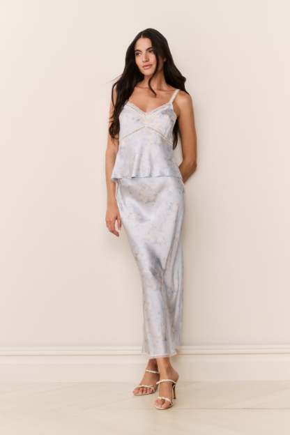 The Kalo Skirt is a flirty maxi designed from our custom satin jacquard. Cut on the bias for an effortless drape, it features an elastic waistband for easy pull-on styling and delicate lace trim at the hem. Slightly longer than our signature Castle Skirt, Kalo pairs perfectly with the Lirena Top.